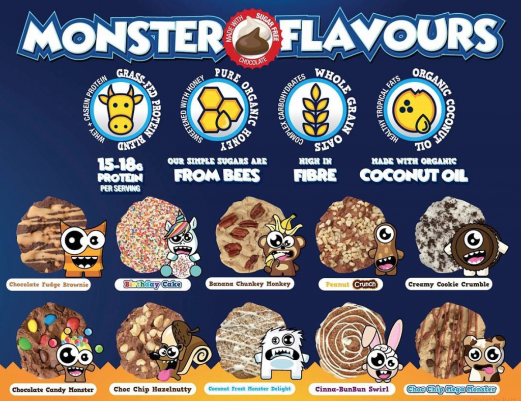 Am vergangenen Wochenende gab schon einmal die erste Möglichkeit den vermeintlich neuen Star am „Protein Cookie Himmel“ live zu kosten. Beim Wettkampf Cologne Beach Style hatte die Marke nämlich einen Stand. Dort gab es bereits fünf der insgesamt 10 Sorten zum Testen. „Peanut Crunch“, „Cinna-BunBun Swirl“, „Choc Chip Hazelnutty“, „Chocolate Fudge Brownie“ und „Birthday Cake“ feierten ihre Premiere und repräsentieren damit schon das umfangreiche Kekssortiment. Doch tatsächlich ist das gerade mal die Hälfte der Auswahl, die Cookie Madness insgesamt anbietet! Zusätzlich können Keksverrückte nämlich auch noch zwischen „Banana Chunkey Monkey“, „Creamy Cookie Crumble“, „Chocolate Candy Monster“, „Coconut Frost Monster Delight“ und „Choc Chip Mega Monster“ wählen.