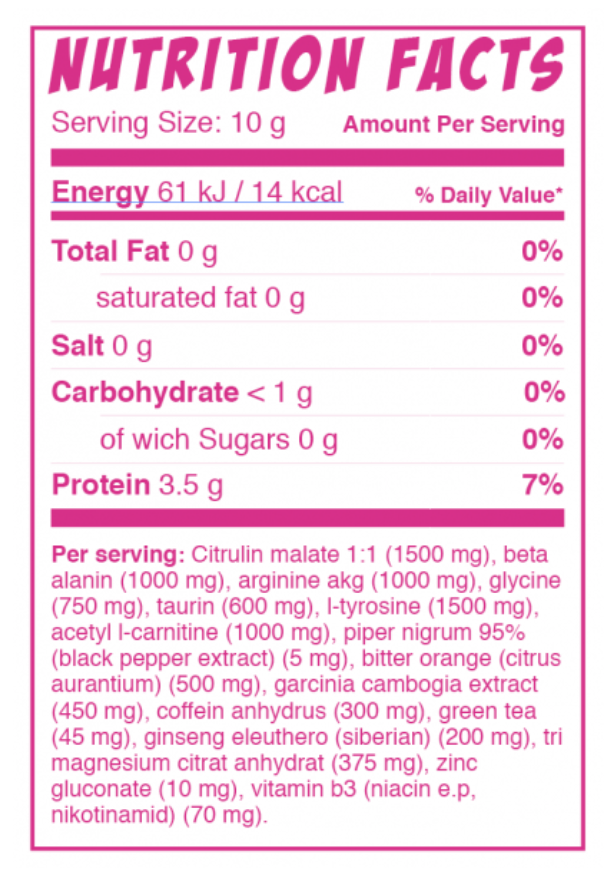 Des Weiteren findet man in Drama Queen alt bekannte Zutaten wie Black Pepper Extrakt, Bitter Orangen Extrakt, Grüntee, sibirischer Ginseng und Magnesium, sowie Zink. Wie es sich für ein Ladies Produkt fast schon gehört, hat GymQueen natürlich auch nicht auf L-Carnitin verzichtet. Man sieht also, dass die Matrix auf den Basics aufgebaut ist und nichts mit einem Hardcore Booster zutun hat. Für Frauen, aber sicherlich auch für Männer mit wenig Pre Workout-Erfahrung dürfte das doch einen Boost im Training geben.