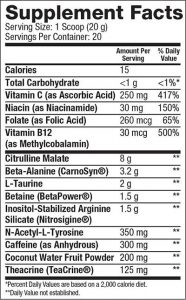 Die ersten fünf Inhaltsstoffe setzen sich aus „heftigen“ 8g (!!!) Citrullin Malat (4,5g davon pures Citrullin) für maximale Leistung und „Monster“-Pumps, 3,2g dose CarnoSyn Beta-Alanin, 2g Taurin und jeweils 1,5g Betain und Nitrosigin (Arginin Silikat) zusammen. Die restlichen vier Wirkstoffe sorgen für mehr Energie und „messerscharfen“ Fokus. Hierbei setzt der PreWO auf 350mg N-Acetyl-L-Tyrosin, 300mg Koffein, 200mg Kokosnusswasser und stark dosierte 125mg Theacrin. Pro Serving kommt man somit insgesamt auf „stolze“ 20g Pulver. Was die Geschmacksrichtungen angeht, soll der PreWO in „Chilled Fruit Fusion“, „Sweet Cherry Lime“ und „Handspun Cotton Candy“ erhältlich sein.