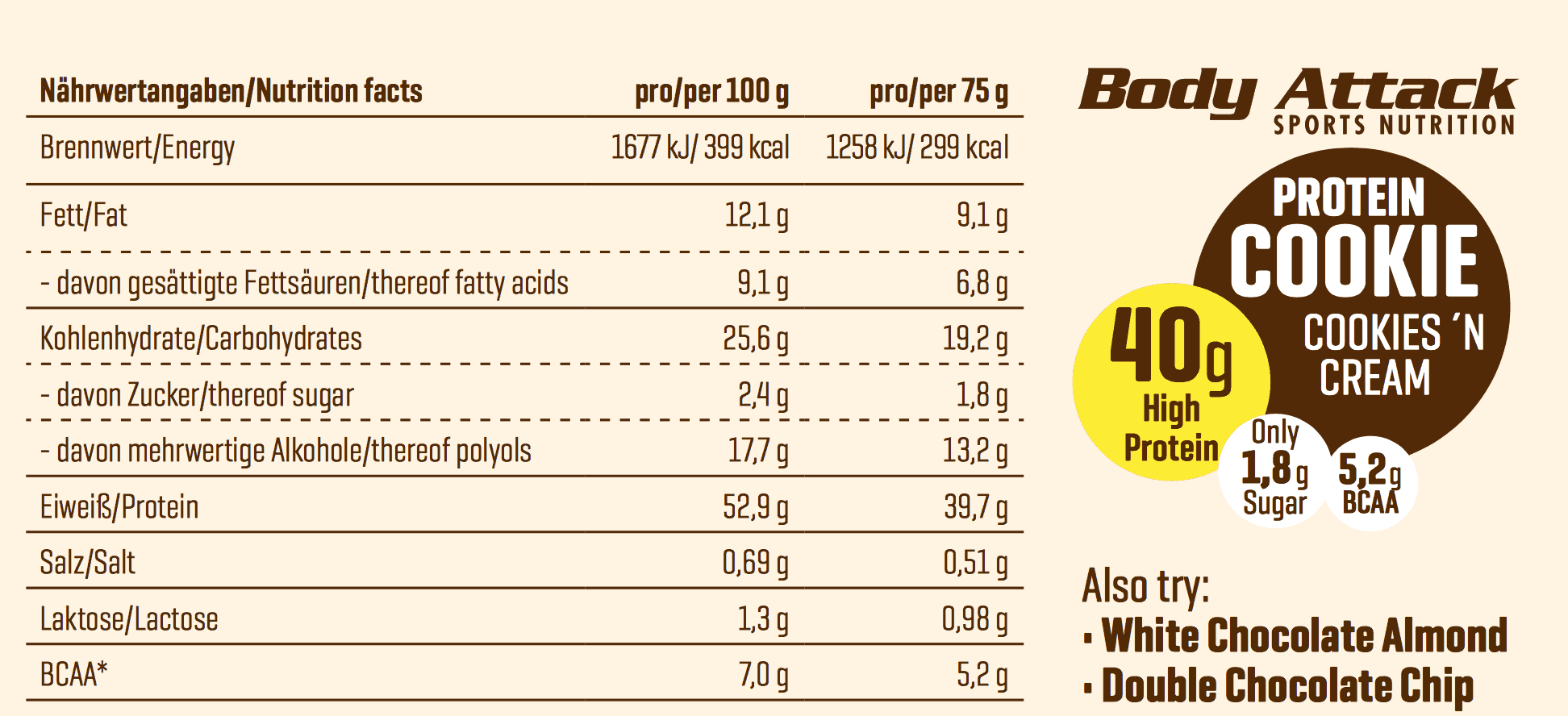 Bei der enormen Auswahl an Eiweißkeksen weis man als Kunde manchmal wahrlich nicht, welchen man zuerst probieren soll. Ausschlaggebend für die Entscheidung sind dann meist der Geschmack oder die Nährwerte der unterschiedlichen Kandidaten. Der neue Protein Cookie von BODY ATTACK könnte hier ganz weit vorne im Ranking landen, denn die Nährwerte des Snacks sind unglaublich! Stolze 40 (!) Gramm Eiweiß soll ein Protein Cookie beinhalten. Die Portionsgröße liegt dabei bei 75 Gramm und reiht sich somit bei den belieben MyCookies von ProSupps, den Muscletech Cookies oder der Variante von WEIDER mit ein. Allerdings haben besagt weitaus weniger Protein zu bieten!