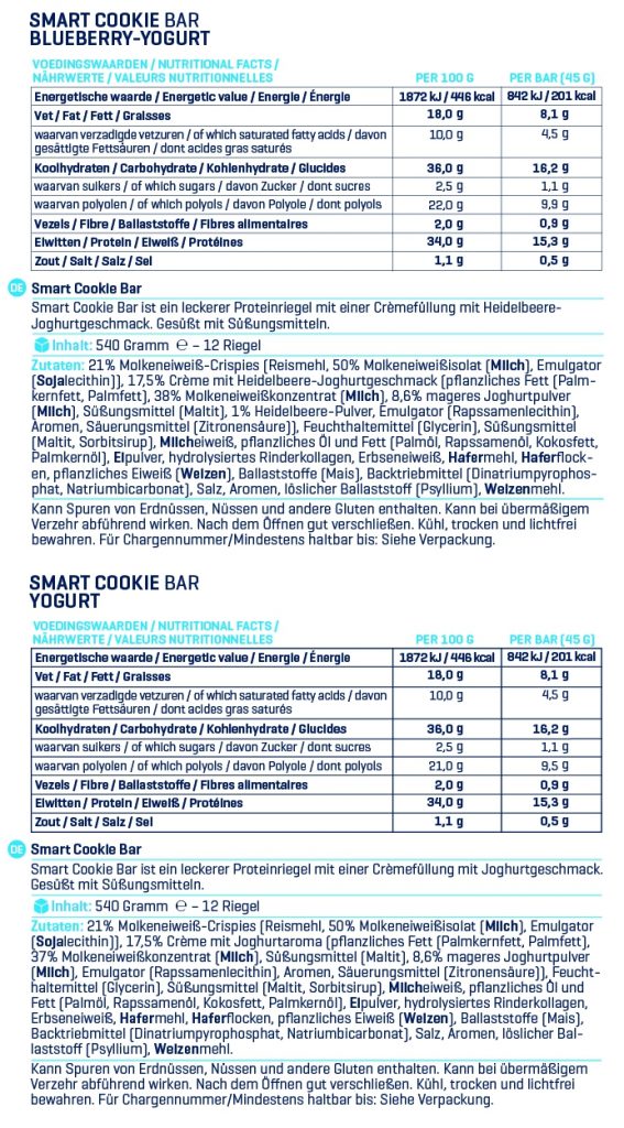 Reinbeißen will man da doch direkt, nicht wahr? Dennoch sollte man sich von der Optik nicht täuschen lassen. Gerade für Sportler zählen natürlich auch die „inneren Werte“. Der ein oder andere vermutet bei den Crispies, die die Konsistenz maßgeblich ausmachen, sicherlich nicht ganz so hochwertige Inhaltsstoffe. Doch tatsächlich hat Body & Fit hier hauptsächlich Milcheiweiß verwendet. Auch die restlichen Inhaltsstoffe können sich im Großen und Ganzen sehen lassen. Dafür sind die Nährwerte nicht unbedingt als „kalorienarm“ zu bezeichnen. Ein Riegel schlägt mit 201 Kalorien zu buche. Davon sind 16.2 Gramm Kohlenhydrate, 8.1 Gramm Fett und 15.3 Gramm Eiweiß. Im ersten Moment klingt das relativ durchschnittlich für einen Eiweißriegel. Doch die Smart Cookie Bar wiegt deutlich weniger, als ein Standard-Proteinriegel. Lediglich 45 Gramm hat ein Riegel. Dafür ist der Kaloriengehalt doch ein wenig höher.