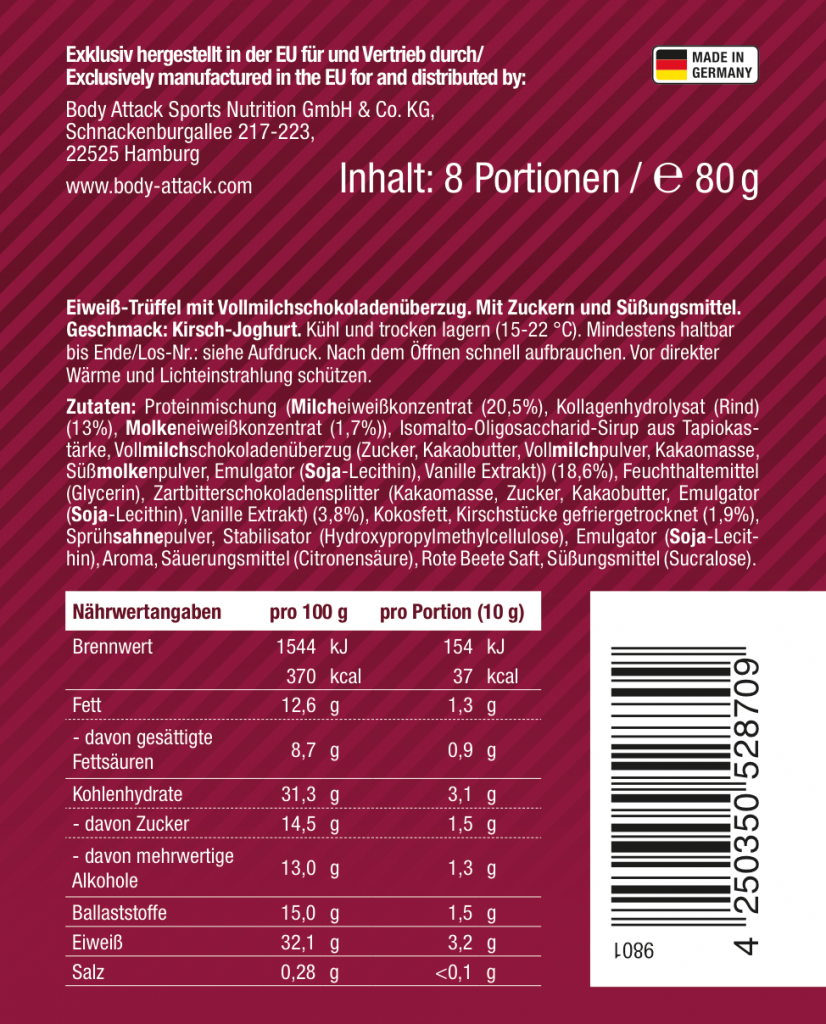Während Deutschland eher einer Herbstlandschaft gleicht, bringen trotzdem viele Hersteller einige saisonale Geschmäcker auf den Markt. Wer den Sommer nicht mit den passenden Produkten feiern kann, der kann ihn sich so immerhin trotzdem ins Geschmackszentrum holen. Die Firma Body Attack dachte sich scheinbar, dass neben all dem Proteineis, den fruchtigen Whey- und Boostersorten, man auch im Snackbereich einen saisonale Anpassung bringen sollte. Deshalb gibt es die hauseigenen Protein Truffles ab sofort in drei Flavourn, die ideal zur heißen Jahreszeit passen sollen. Statt wie bisher „Chocolate“ und „White Chocolate Coconut“, können Freunde der Pralinen jetzt auch noch zwischen „Cherry Yoghurt“, „Strawberry Yoghurt“ und „Cappuccino“ wählen. Die Nährwerte aller Geschmacksrichtungen sind dabei relativ ähnlich: