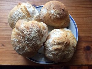 Die Teigstücke wiegen und in flache, gleichmäßie Fladen formen und kneten. Diese auf ein mit Backpapier ausgelegtes Backblech legen. Nun die Fladen noch einmal kräftig mit Wasser, zum Beispiel mit einer Blumenspritze, besprühen und im vorgeheizten Backofen bei 175 Grad Ober-/Unterhitze 50 – 55 Minuten backen.