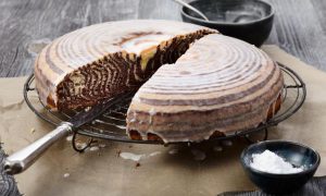 Den Teig immer auf die gleiche Stelle in der Mitte der Form tropfen lassen. Je mehr Masse es wird, je mehr verteilt sich der Teig von selbst in der Springform und das Muster entsteht.