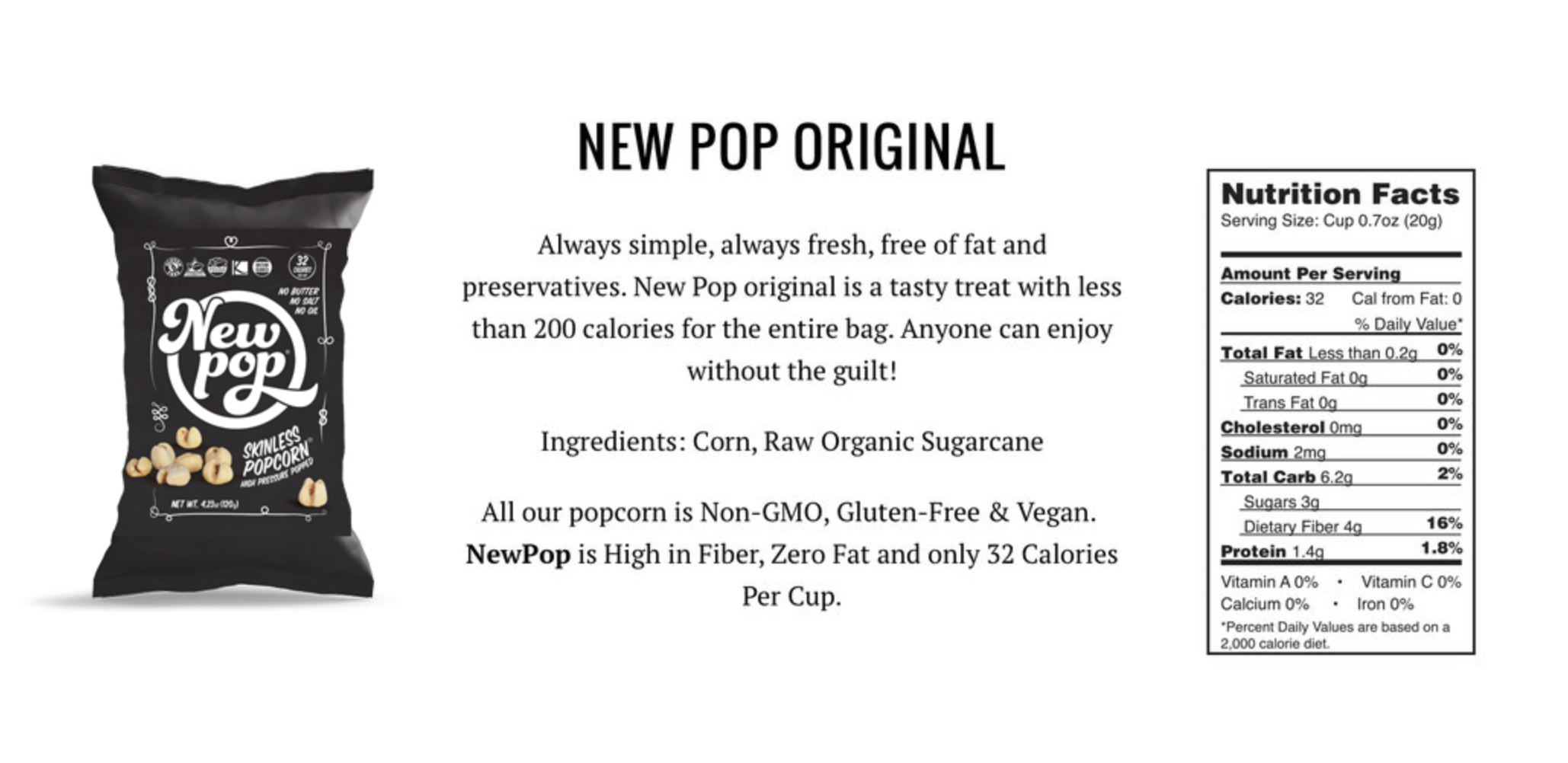 Die noch junge Marke NewPop hat mit ihrem „Skinless Popcorn“ in den USA eine wahre Innovation auf den Markt gebracht. Laut Hersteller soll eine 20 Gramm Portion, die eine deutliche Menge ist, nur 32 Kalorien haben. Hierbei soll sich der Kohlenhydratanteil auf 6 Gramm beschränken und der Fettgehalt auf nur 0.2 Gramm. Die restlichen Nährwerte stammen von 1.4 Gramm Eiweiß.