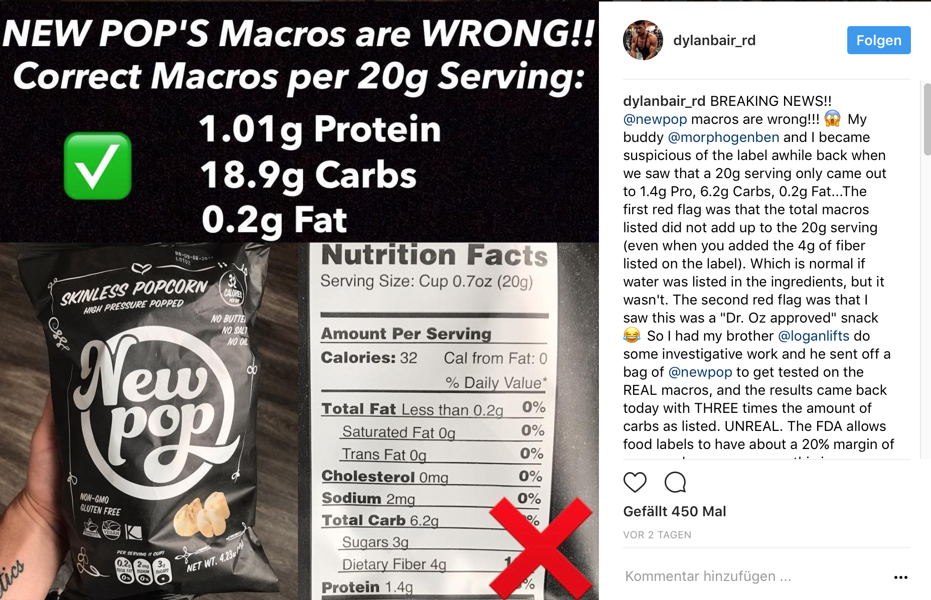 Diese Fakten klangen für manche schon wirklich zu gut um wahr zu sein. Deshalb haben sich eine Bikini Athletin und ihr Freund, der Ernährungsberater und Personal Trainer ist, gedacht, sie sollten das Ganz mal auf ihre Richtigkeit testen. Ein Freund, der Kontakte zu einem Lebensmittellabor hat, hat daraufhin einige Packungen des NewPop Popcorns testen lassen und erschreckende Abweichungen festgestellt. Demnach hat das Produkt dreimal so viele Kohlenhydrate, wie vom Hersteller angegeben!