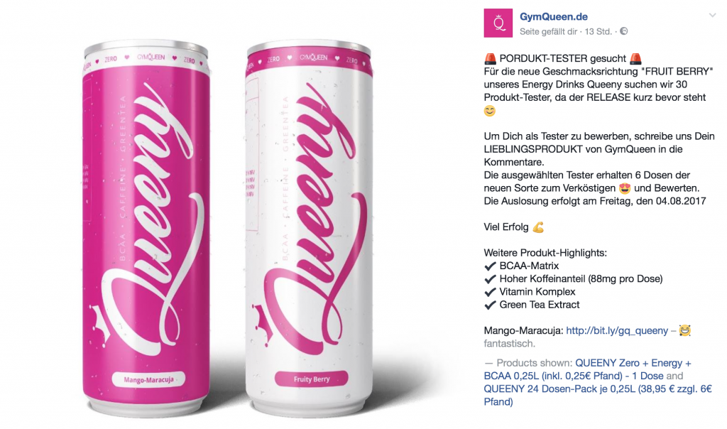Auf Facebook hat GymQueen nun einen Aufruf gemacht, bei dem man sich als Produkttester für den neuen Queeny Flavour bewerben kann. Im Rahmen eines Gewinnspiels kann man sich bis zum 4. August bewerben. Die ausgewählten Kandidaten erhalten dann jeweils sechs Dosen der neuen Geschmacksrichtung „Fruit Berry“.