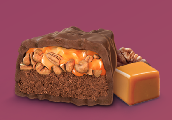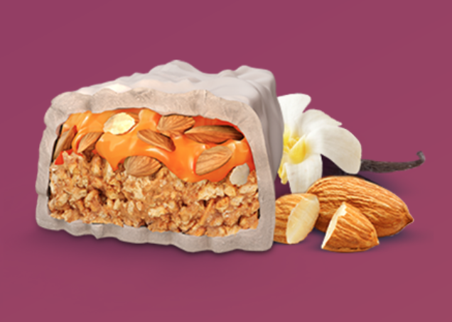 Diese Sorte ist ebenfalls mit weißer Proteinschokolade überzogen. Die Füllung besteht aus cremigem Caramel und echten Mandelstückchen.