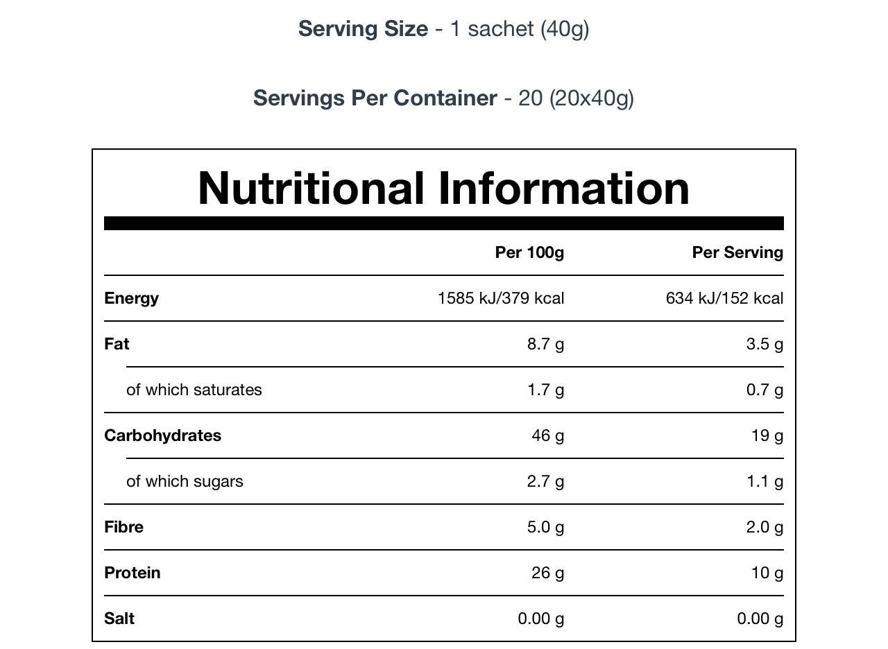 Eine Portion soll 40 Gramm auf die Waage bringen und ganze 10 Gramm Eiweiß liefern. Der Zuckergehalt ist mit 1.1 Gramm sehr überschaubar und auch der Fettgehalt hält sich mit 3.5 Gramm in Maßen.