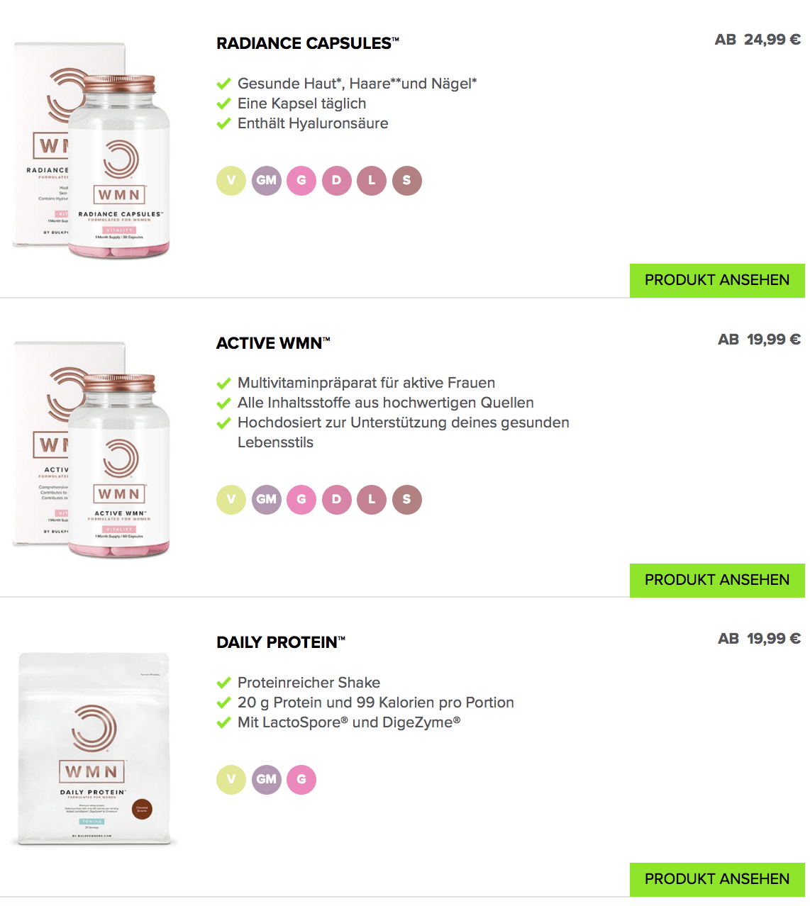 Das Kapselsortiment der WMN Reihe hat gleich drei Auswahloptionen zu bieten. Bulk Powders verspricht dabei, dass das „Active WMN“-Multivitamin besonders gut auf Frauen mit einem aktiven Lebensstil abgestimmt ist. Wichtige Nährstoffe, wie Eisen, Zink und Folsäure sind deshalb in hoher Dosierung enthalten.