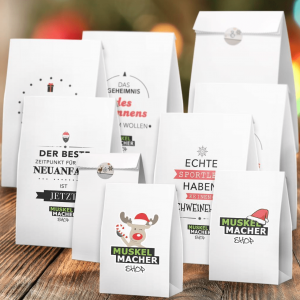Wer nämlich einmal genauer hinsieht, erkennt, dass die Karikaturen auf der Vorderseite die Shopbesitzer Simon und Sarah. Auf der rechten Seite haben die beiden sogar noch ihre Hündin Josi darstellen lassen, damit die „Muskelmacher Familie“ auch komplett vertreten ist. Die beiden Gründer des Shops versorgen dabei offenbar noch die letzten Bestellungen für das große Fest, während der Weihnachtsmann ein „Last-Minute-Workout“ absolviert und sich für die Auslieferung stärkt.