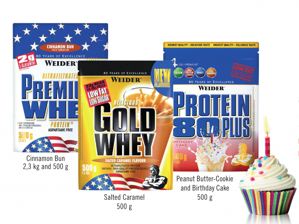 Mit den Jahren hat sich bei Weider vor allem ein Eiweiß zum Bestseller entwickelt. Die Rede ist dabei vom Protein 80 Plus. Das Mehrkomponenten Eiweiß hat sicherlich jeder schon einmal probiert oder gesehen. Nicht zuletzt begeisterte es vor allem auch aufgrund des guten Geschmacks und der cremigen Konsistenz. Letztere ist natürlich mit der Zusammensetzung aus mehreren Proteinquellen zu erklären. Dennoch wurde es in letzter Zeit immer ruhiger um Weiders Bestseller. Irgendwie gab es keine wirkliche Weiterentwicklung. Seit der FIBO ist das Geschichte. Hier hat der Hersteller nämlich seine zwei neuen Geschmäcker für das Protein vorgestellt. Richtig amerikanisch gibt es das Protein 80 nun auch in Birthday Cake und Peanut Butter-Cookie.