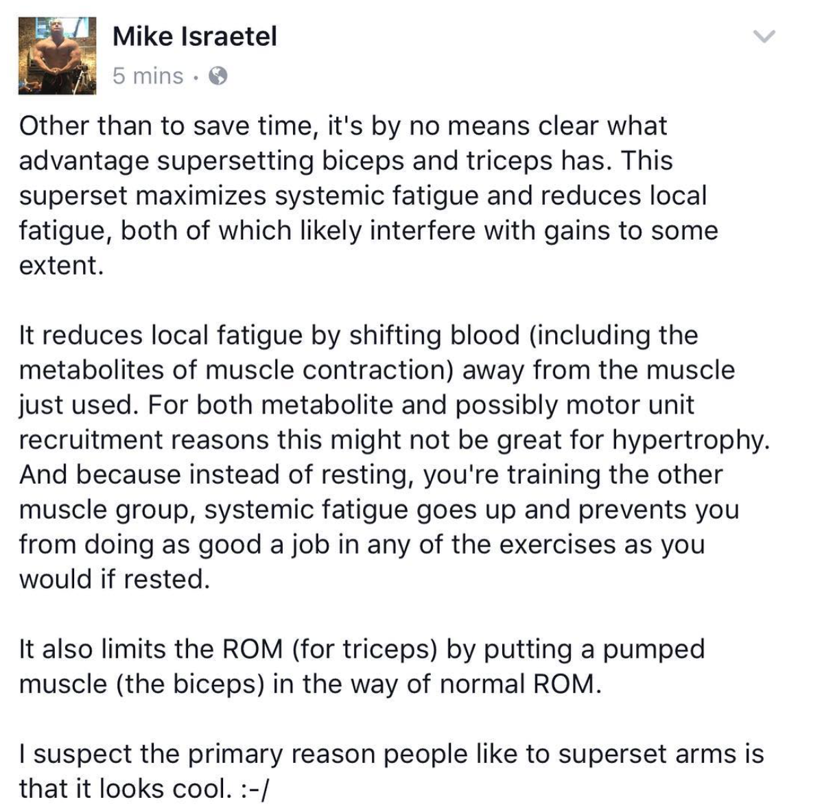 Der Professor stellt in seinem Facebook Statement klar, dass er absolut kein Fan von solchen Trainingsmethoden ist. In seinen Augen dienen Supersätze wohl auch nur dazu, die Muskulatur gut aufzupumpen und dadurch „cool“ auszusehen.