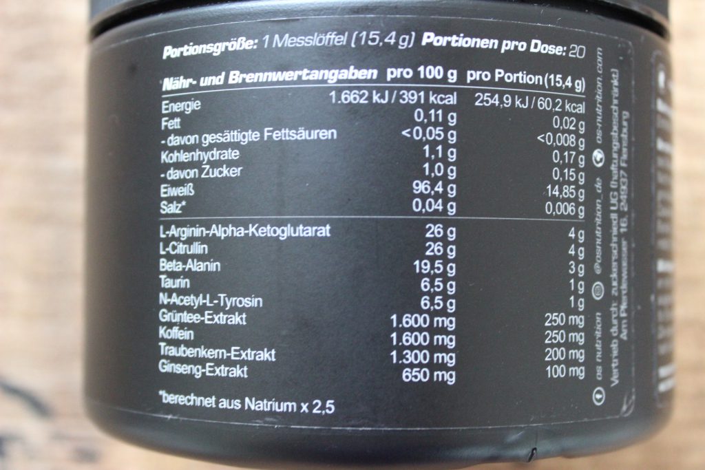 Betrachtet man die Formel, fällt einem als erstes die Transparenz der einzelnen Inhaltsstoffe auf. Die exakte Menge jedes Wirkstoffs lässt sich äußerst leicht erkennen und man weiß direkt, was man mit jedem Serving zu sich nimmt. Was die versprochene Wirkung angeht, befinden sich diverse Fokus, Kraft und Pump fördernde „Zutaten“ in der Formel. Für den Pump sollen 4g L-Citrullin und 4g L-Arginin-Alpha-Ketoglutarat sorgen – die Dosierung beider „Stoffe“ ist recht solide, hätte aber noch etwas höher ausfallen können für eine „perfekte“ Pump-Matrix. Die 200mg Traubenkern-Extrakt sollen die Wirkung der Matrix verstärken, allerdings ist dessen tatsächliche Wirkung noch umstritten. Mehr Kraft(ausdauer) und eine verringerte Müdigkeit versprechen 3g Beta Alanin, 250mg Koffein, 250mg Grüntee-Extrakt und 100mg Ginseng-Extrakt. Auch hier fallen die Dosierungen für einen EU-Booster relativ gut aus. N-Acetyl-Tyrosin ist für seine Fokus und Wohlbefinden verbessernde Wirkung bekannt und mit 1g pro Serving okay dosiert. 1,5-2g von der Aminosäure wären in dieser Formel allerdings optimaler gewesen. Taurin rundet die Zusammensetzung ab und soll mit 1g dabei helfen alle in der Formel enthaltenen Inhaltsstoffe für den Körper „verfügbarer“ zu machen.