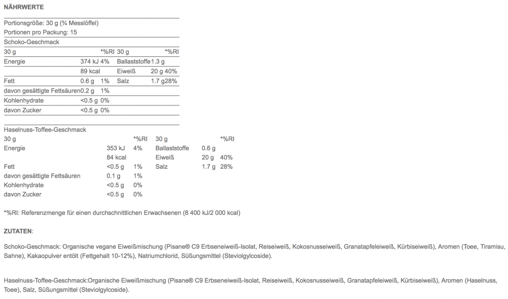 Die Nährwerte können sich in jedem Fall auch sehen lassen. Immerhin hat eine 30g Portion 20g Eiweiß und dabei nur 0.6g Fett und weniger als 0.5g Kohlenhydrate.