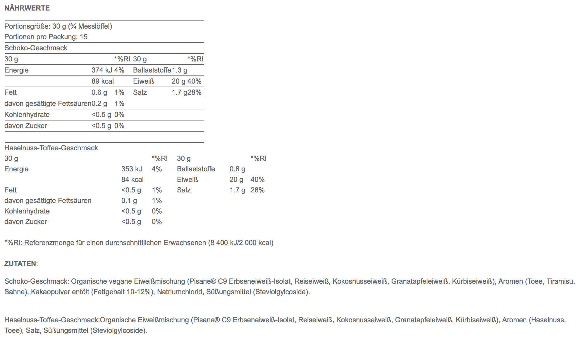 Mit 17.90€ für 450g ist das vegane Merhkomponenten-Protein dann doch eine Ecke preiswerter, als man es vom Hersteller gewohnt ist. Zum Vergleich: das Plant Protein bietet Scitec für 19.90€ an, allerdings bei doppelter Menge!