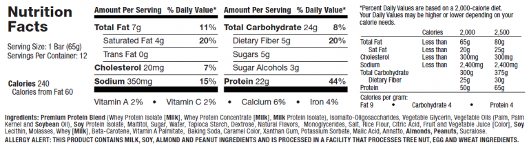 Im Vergleich zu den Riegeln vieler anderer Hersteller setzt Muscletech bei dem Nitrotech Crunch gleich auf vier Proteinquellen. Neben Whey Isolat als Hauptproteinquelle, finden sich zudem Whey Concentrate, Milchproteinisolat und Sojaproteinisolat in der „Bar“. Die Hauptkohlenhydratquelle besteht aus Isomalto-Oligosacchariden, auch bekannt als Vitafiber. Glutenunverträglichkeitsgeplagte kommen bei dem Riegel auch auf ihre Kosten, da dieser komplett glutenfrei ist. Mit 22g Protein, 24g Kohlenhydrate (davon 5g Ballaststoffe, 5g Zucker und 3g Zuckeralkohole), und 7g Fett (4g davon gesättigt) schlägt ein 65g schwerer Riegel mit insgesamt 240 Kalorien zu Buche.