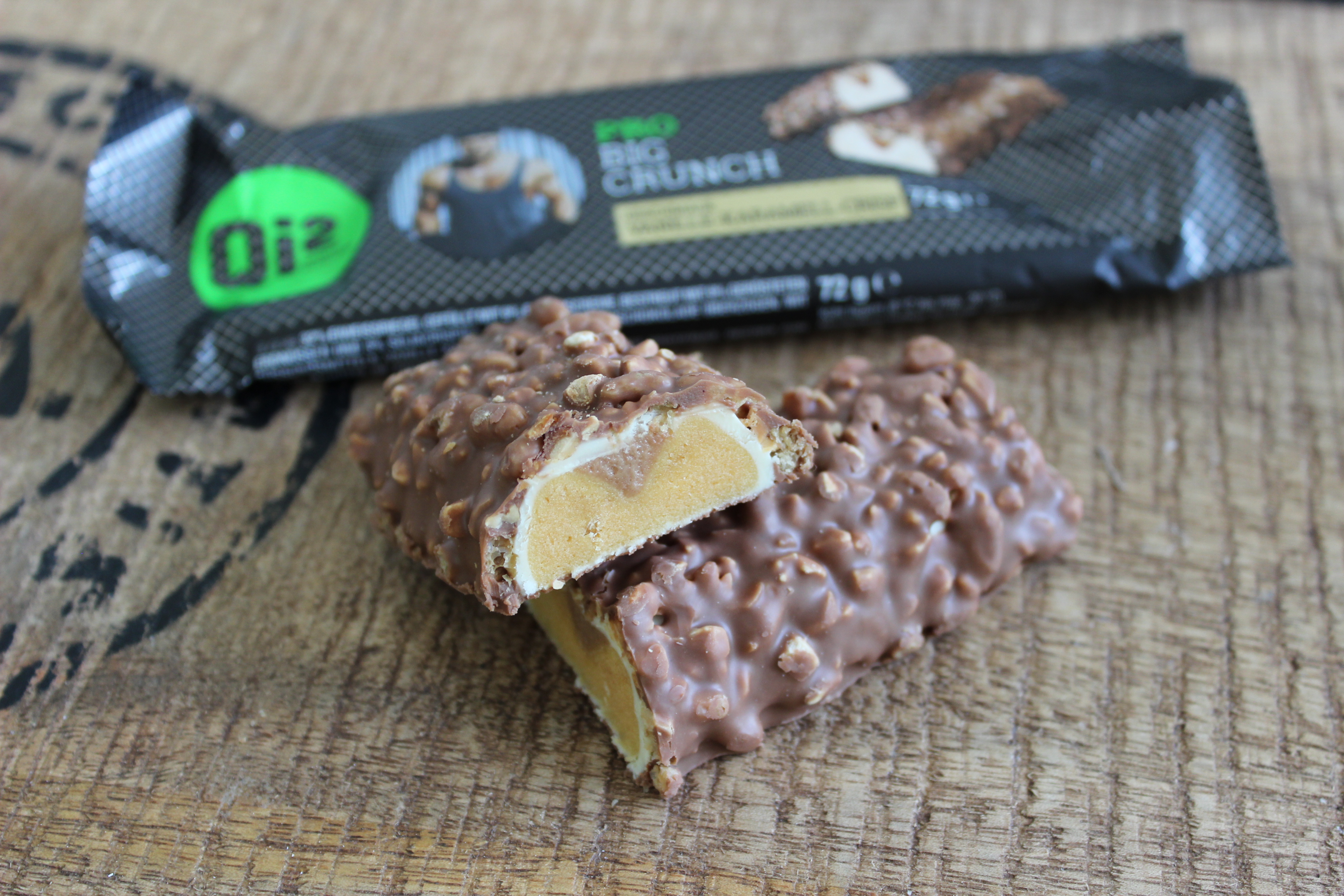 Qi2 setzt bei dem Pro Big Crunch auf zwei tierische und eine pflanzliche Proteinquelle. Neben Milcheiweiß als Hauptproteinquelle, finden sich zudem Vollmilchpulver und Sojaeiweißisolat in dem Proteinriegel. Die Hauptkohlenhydratquelle besteht aus dem Zuckeraustauschstoff bzw. Zuckeralkohol, Maltit, welcher aus der Hydrierung von Malzzucker gewonnen wird. Mit 23g Protein, 28g Kohlenhydraten (2,8g Zucker und 23g Zuckeralkohole), und 14g Fett (7,2g davon gesättigt) schlägt ein 72g schwerer Riegel mit insgesamt 298 Kalorien zu Buche.