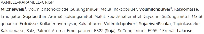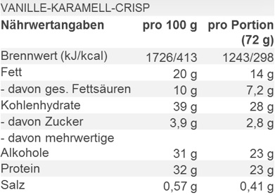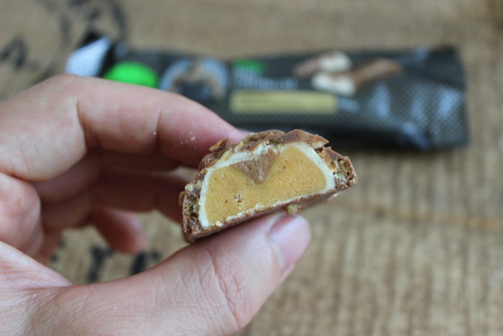 Betrachtet man den „Mantel“ des Pro Big Crunch Riegels, fallen einem besonders die – ähnlich wie beim Nogger-Eis – knusprigen (Erdnuss-)Stückchen. Beißt man in den Riegel beißt, sind es auch genau diese kleinen Stückchen, die gepaart mit dem Schokoüberzug als Erstes zur Geltung kommen und für den Crisp-„Effekt“ sorgen. Der Vanillegeschmack geht aufgrund des starken Karamellgeschmacks allerdings etwas unter. Ein Ticken weniger Karamell und das Vanille-Aroma hätte ein „Chance“ gehabt. Somit hätte die Bezeichnung „Karamell-Crisp mit einem Hauch von Vanille“ in dem Fall als Geschmacksrichtung wohl besser gepasst. Im Großen und Ganzen ist der Pro Big Crunch jedoch ziemlich lecker!