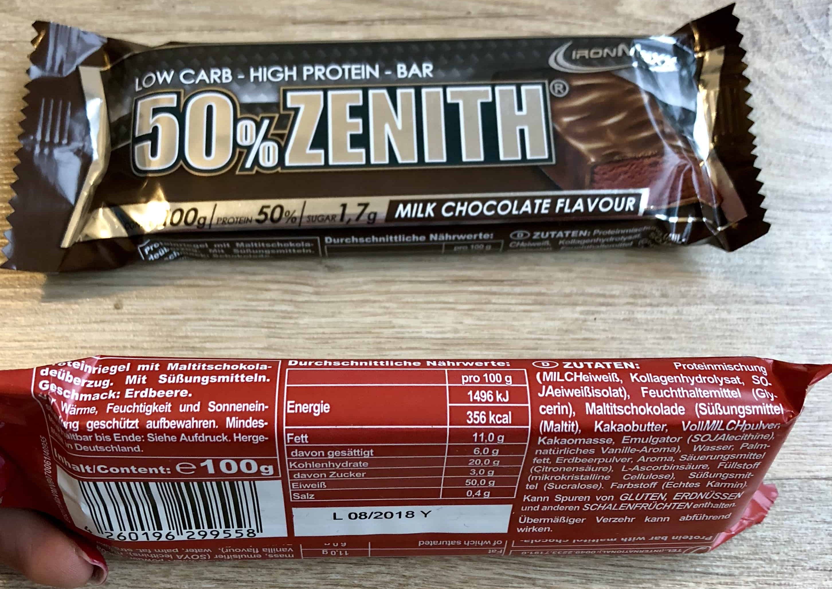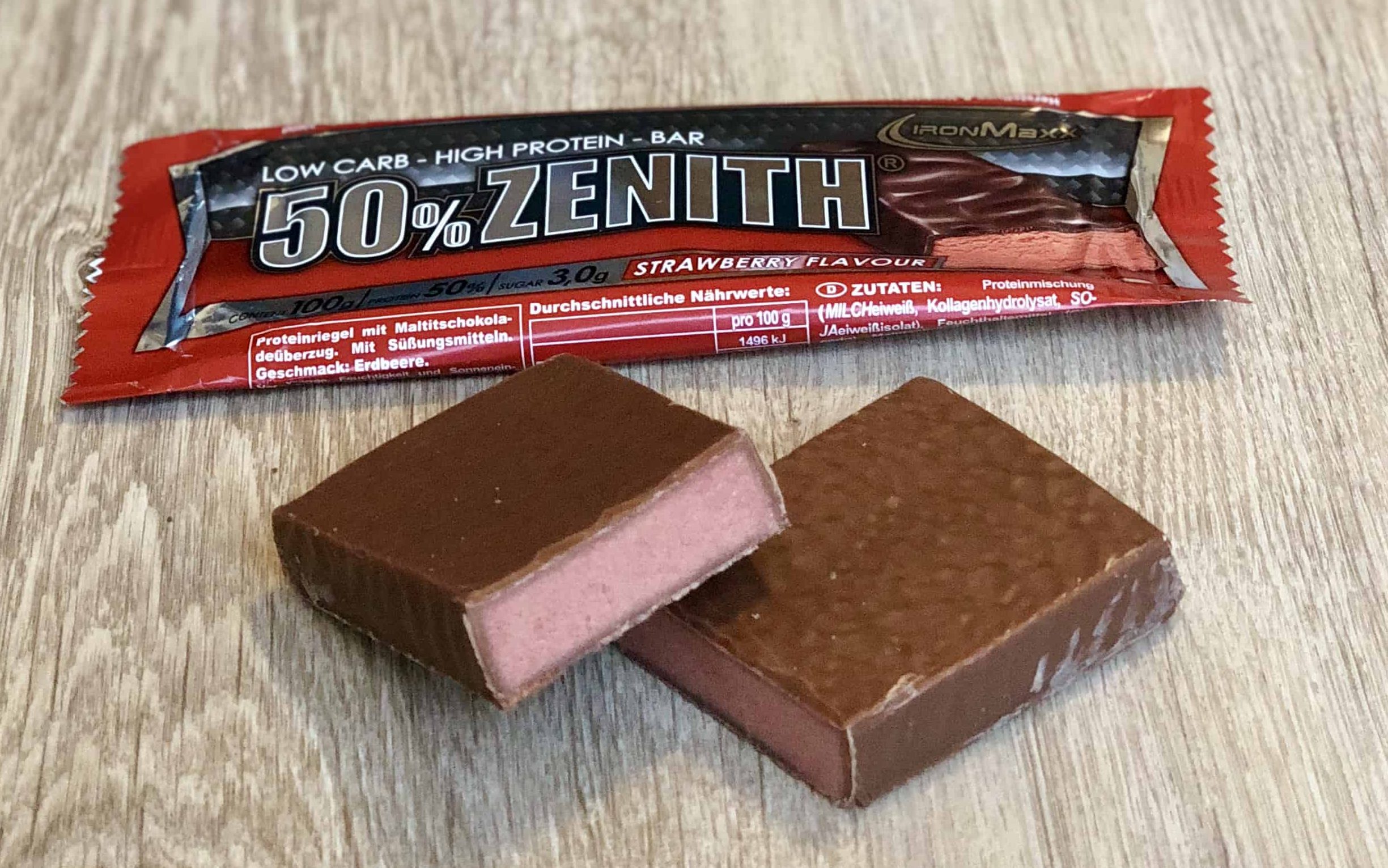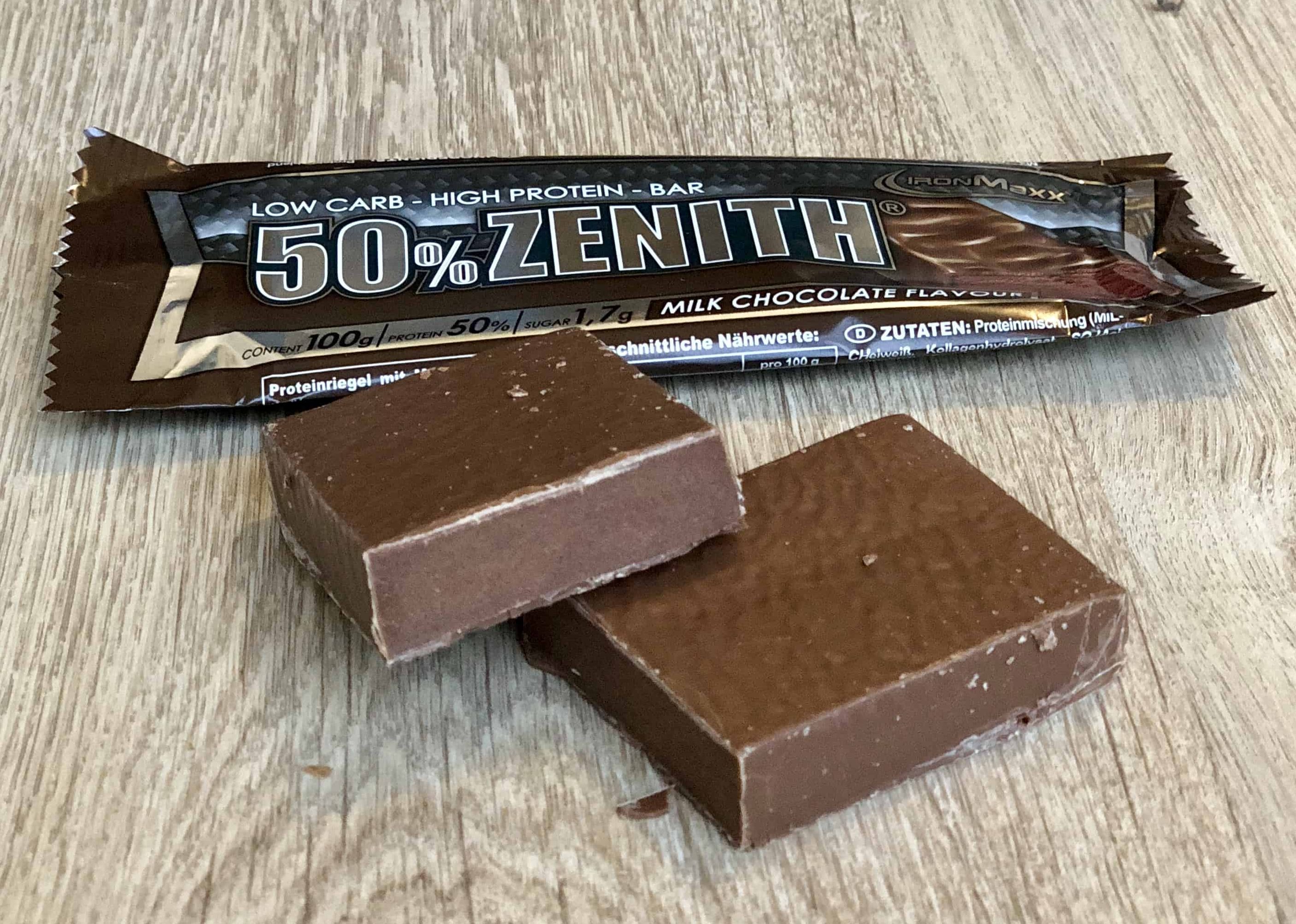 Die Besonderheit des ZENITH Riegels soll laut IronMaxx der enorm hohe Proteingehalt bei außerordentlich niedrigem Kohlenhydratanteil sein. Die Entwickler haben dafür vor allem Zuckeraustauschstoffe verwendet. Deshalb liefert ein 100 Gramm Riegel, je nach Sorte, tatsächlich nur 1.7 bis 3 Gramm Zucker. Für eine Proteinbar dieser Größe ist das wirklich ein Statement.