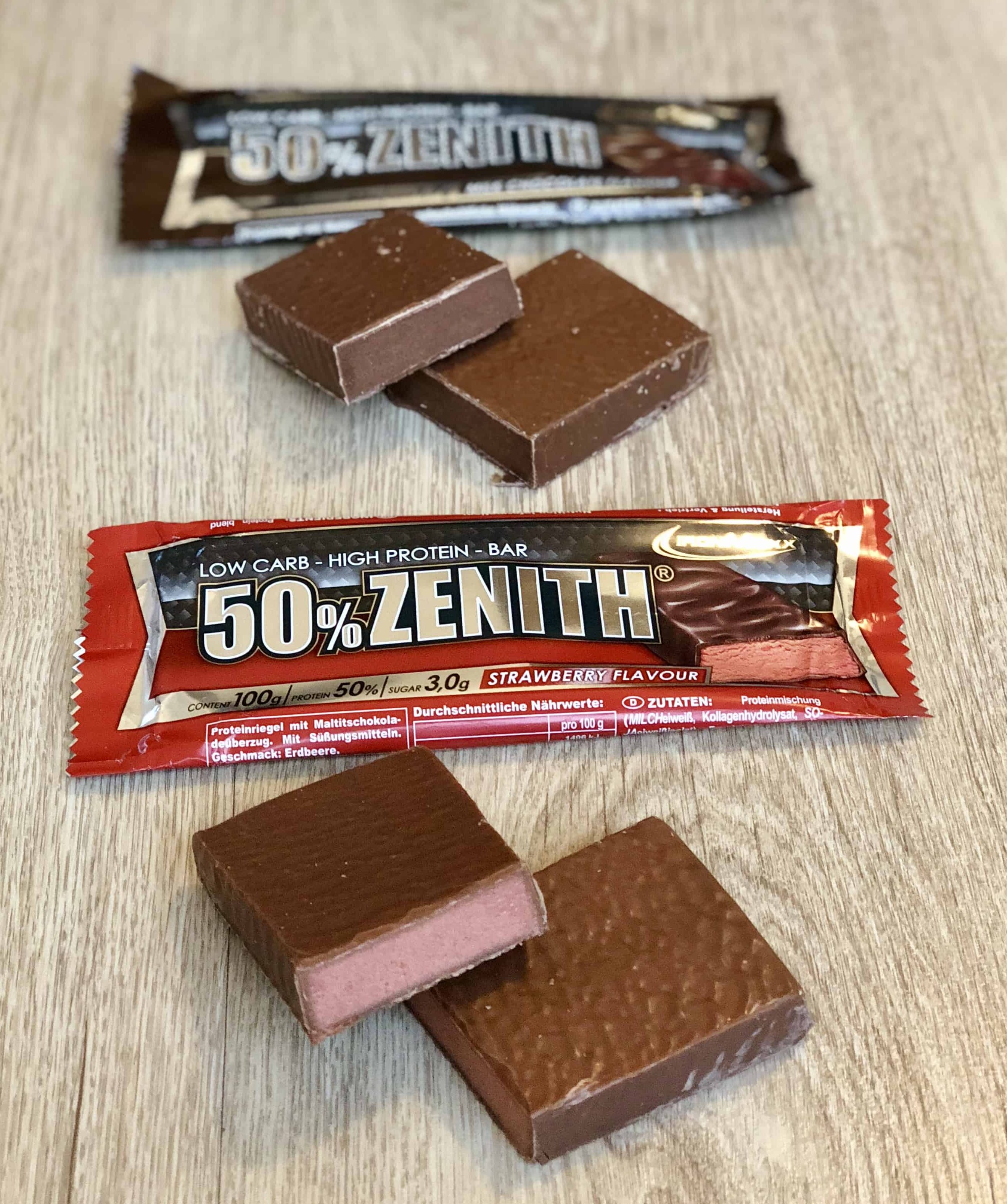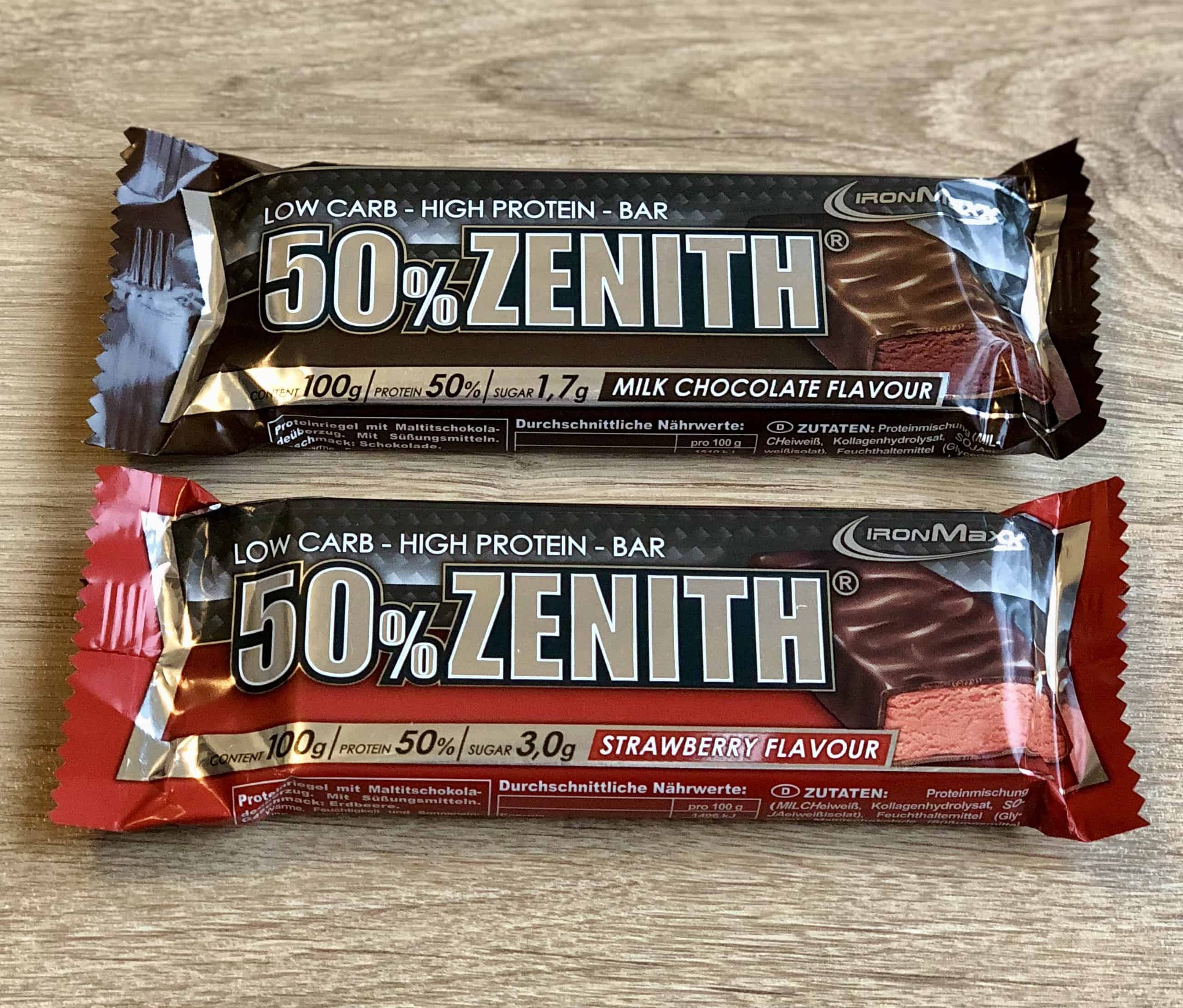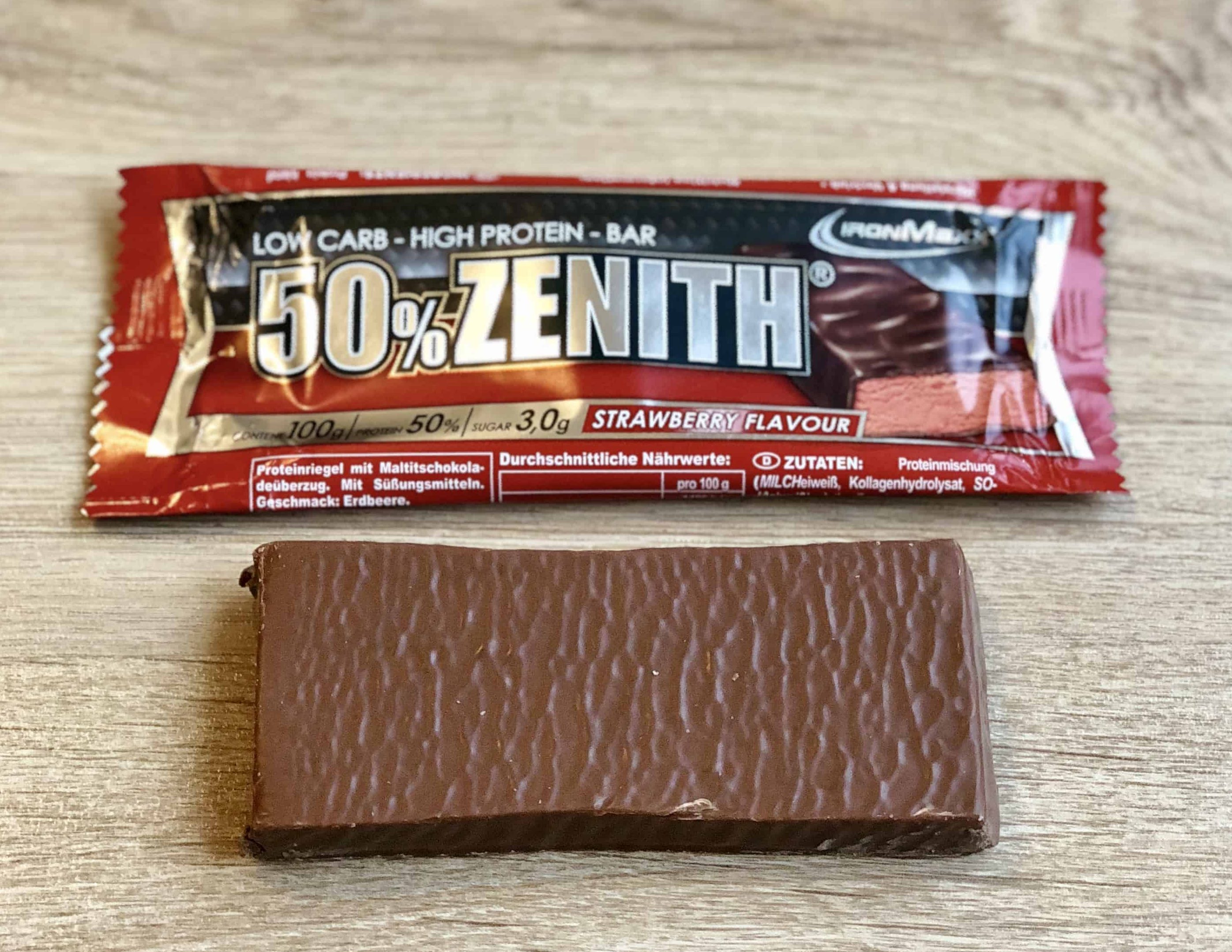 Die Besonderheit des ZENITH Riegels soll laut IronMaxx der enorm hohe Proteingehalt bei außerordentlich niedrigem Kohlenhydratanteil sein. Die Entwickler haben dafür vor allem Zuckeraustauschstoffe verwendet. Deshalb liefert ein 100 Gramm Riegel, je nach Sorte, tatsächlich nur 1.7 bis 3 Gramm Zucker. Für eine Proteinbar dieser Größe ist das wirklich ein Statement.