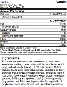 Des Weiteren stoßen wir auf Soja-Crispies, die sich als dunkle Bällchen im GLADIATOR bemerkbar machen. Auch von ihnen kommt sicherlich ein kleiner Teil des Eiweißgehalts im Riegel. Insgesamt beläuft dieser sich auf 21 Gramm auf 60 Gramm. Diesen Wert findet man mittlerweile bei den meisten Proteinriegeln dieser Größenordnung. Auch der Kaloriengehalt von 220 kcal ist hier absolut im Rahmen. Mit rund 8.3 Gramm Fett, 16 Gramm Kohlenhydraten und nur 1.1 Gramm Zucker kann sich OLIMP hiermit also absolut sehen lassen.