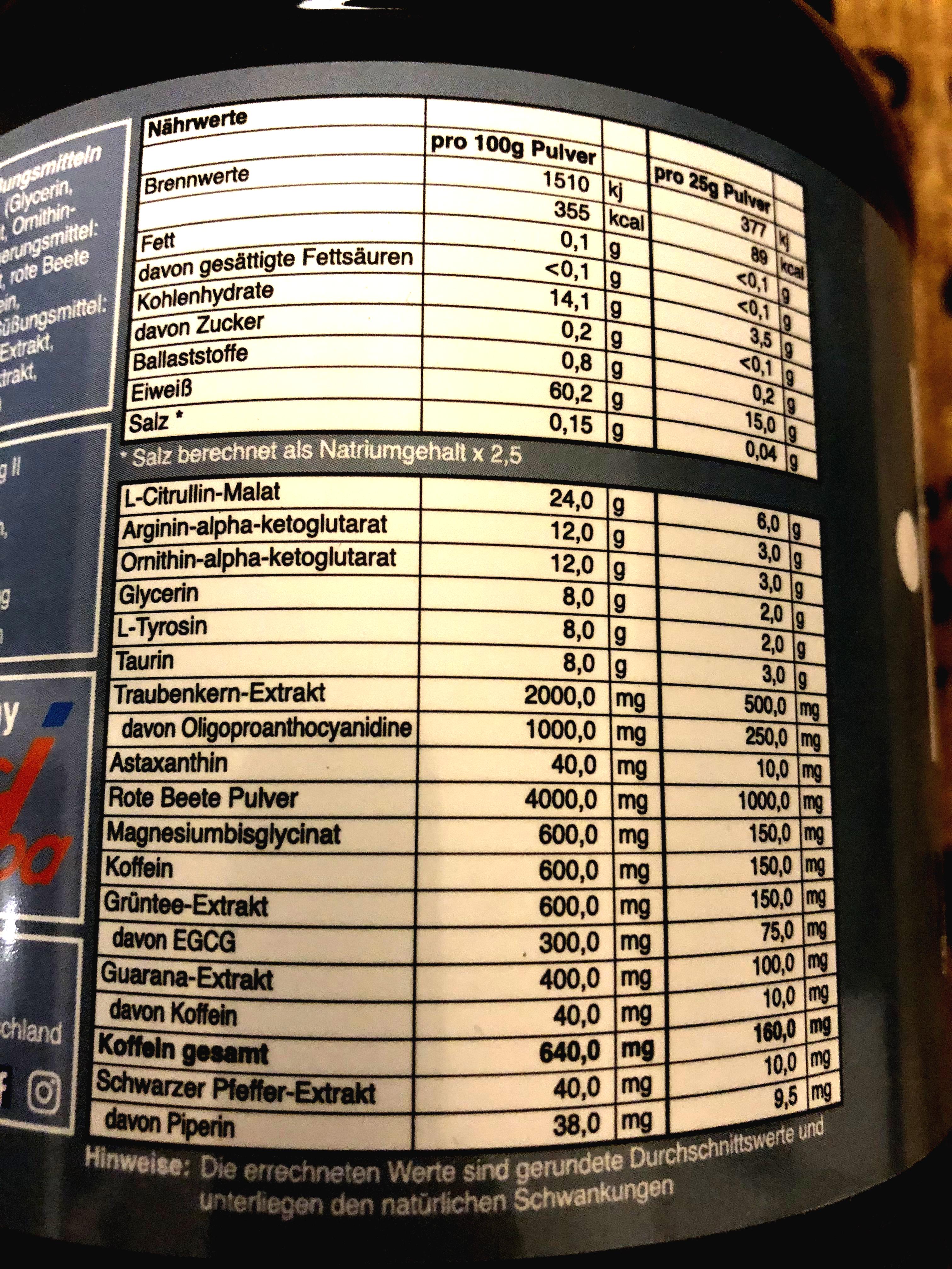 2. Beim übertragen des Etiketts hat sich ein kleiner Druckfehler eingeschlichen: Auf dem Etikett sind 3g Taurin angegeben, richtig ist allerdings die Angabe 2g. Auf der Webseite findet ihr allerdings die korrekten Angaben.