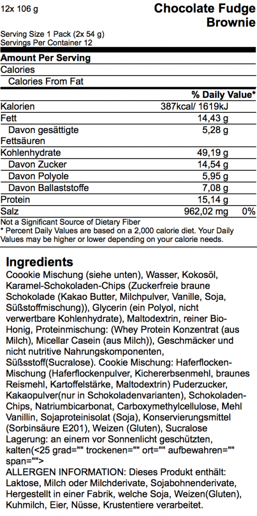 Neben dem Geschmack sind gerade für die Fitnessgemeinde natürlich die Inhaltsstoffe entscheidend. Hier sollte man bei der Nährwertedeklarierung ein wenig aufpassen. Madness Nutrition gibt auf der Rückseite nämlich die Angaben für 2 (!) Cookies an. Da in einer Packung auch zwei Kekse à 54 Gramm enthalten sind, muss man die Nährwerte einfach jeweils durch zwei teilen, um den Gehalt eines einzelnen Kekses zu erfahren. Zwei Cookies haben, je nach Sorte, zwischen 332 und 387 Kalorien. Dabei verspricht der Hersteller zwischen 15 und 18 Gramm Eiweiß auf 106 Gramm. Folglich seid ihr bei einem Keks (54 Gramm) bei rund 7-8 Gramm. Das entsprich auch etwa den Nährwerten eines halben beziehungsweise ganzen Muscletech oder ProSupps Cookies. Auch der Kohlenhydratanteil ist relativ ähnlich, wobei Madness Nutrition sehr stark damit wirbt, nur „guten“ Zucker zu verwenden. So sollten die Kekse ausschließlich Bio-Honig und brauner Zucker enthalten. Allerdings findet man in der Auflistung der Zutaten auch Maltodextrin. Außerdem sei der gesundheitliche Vorteil von braunem Zucker gegenüber weißem Zucker mal dahingestellt. Am Ende ist es Zucker, der mit rund 15 Gramm pro zwei Kekse zu Buche schlägt. Folglich haben wir also auch hier ähnliche Angaben, wie die Konkurrenz.