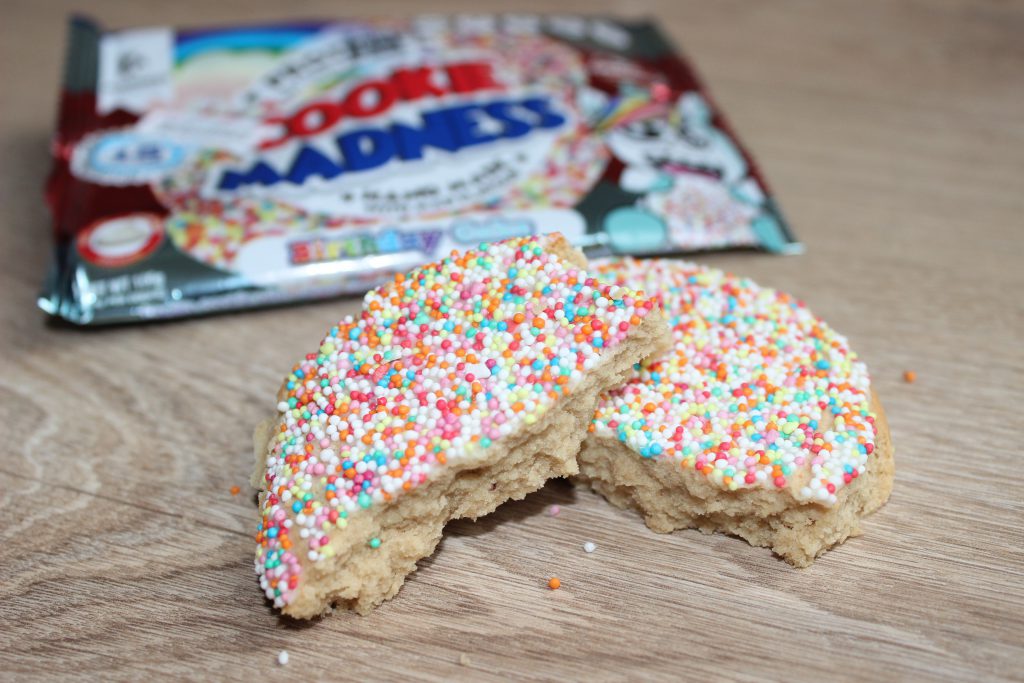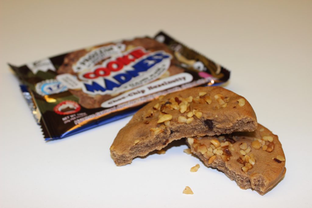 Vorweg sei gesagt, dass diese Sorte einstimmig unser Favorit war! Die vom Hersteller versprochene weiche Konsistenz war hier definitiv gegeben. In der Tat fällt der Cookie beim in die Hand nehmen schon beinahe auseinander, so fluffig war er. Von einem zähen Proteinkeks ist hier definitiv keine Spur! Die Sorte Birthday Cake beschreibt Madness Nutrition als „Vanille Keks mit weiße Schokolade Icing und bunten Candy Sprinkles“. Die Gesamtkomposition ist hier wirklich gut gelungen. Der Keks schmeckt angenehm nach Vanille und die Sprinkles sorgen für ein knuspriges Gefühl beim Essen. Einige kleine Schokoladenstückchen sind sogar auch noch enthalten. Deshalb erinnert uns diese Sorte sehr an die hellen Vanilla-Chocolate-Chip Muffins, die es in einigen Lebensmitteldiscountern gibt. Geschmack, Konsistenz und Geschmacksdeklarierung ist für uns hier top!