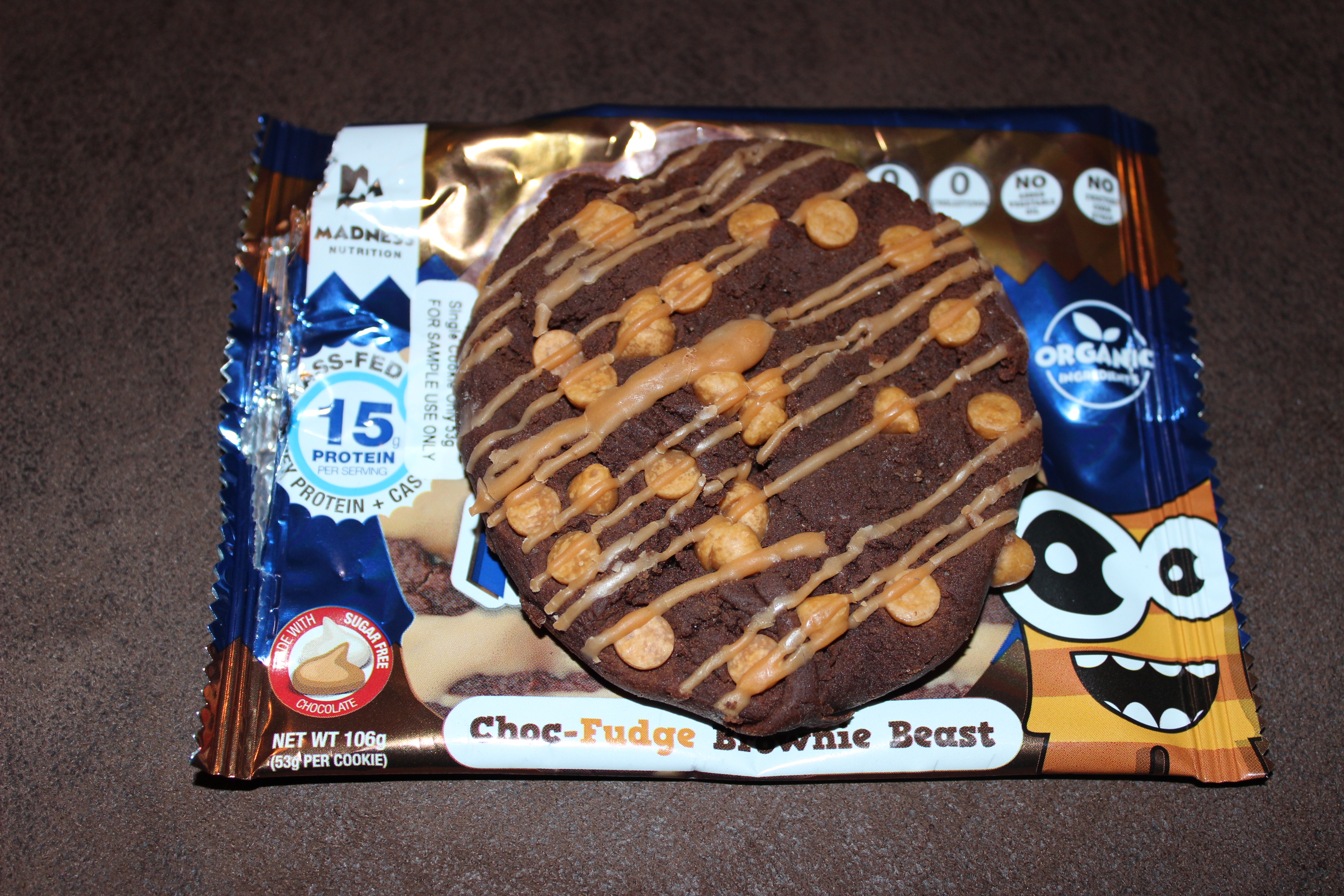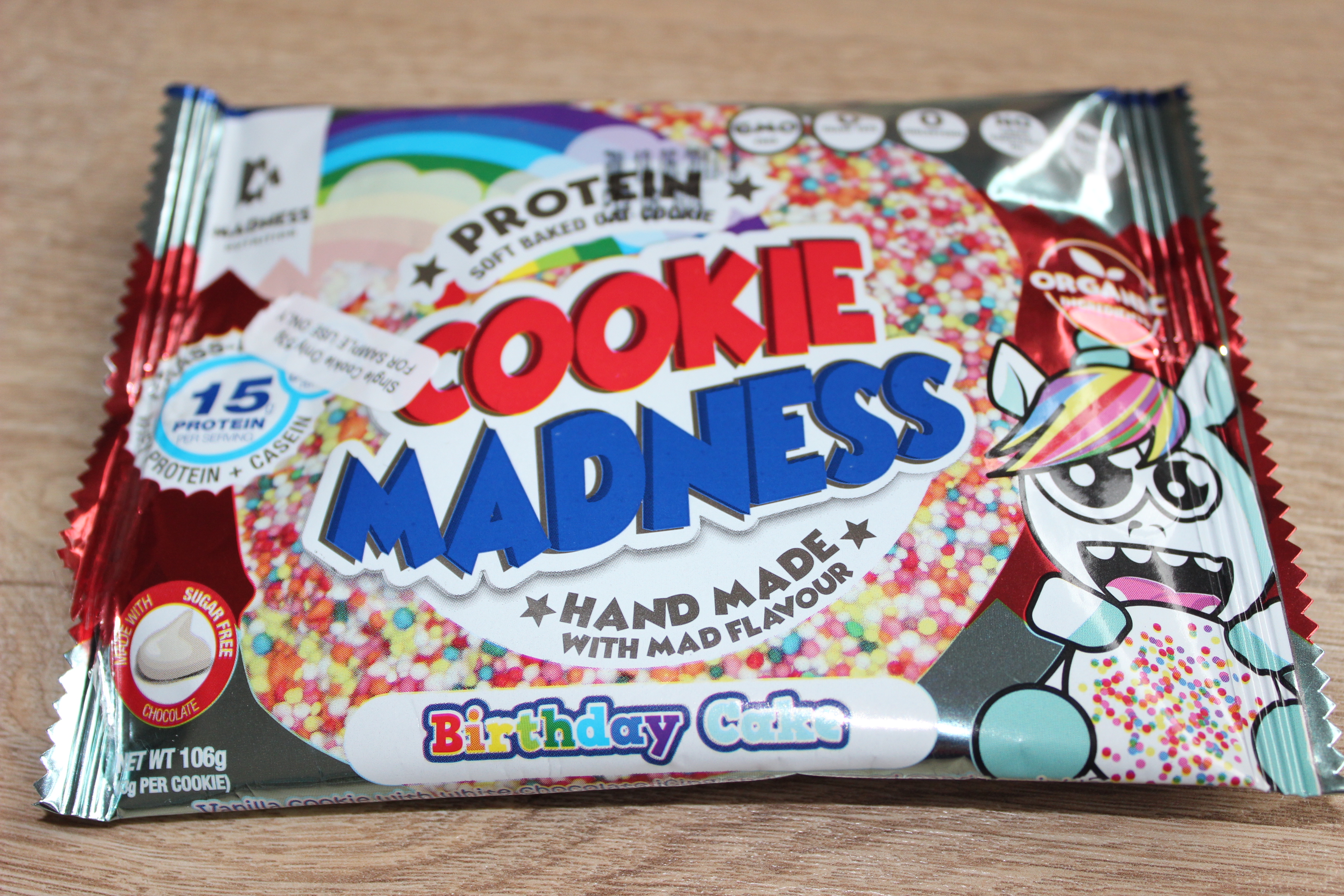 Vorweg sei gesagt, dass diese Sorte einstimmig unser Favorit war! Die vom Hersteller versprochene weiche Konsistenz war hier definitiv gegeben. In der Tat fällt der Cookie beim in die Hand nehmen schon beinahe auseinander, so fluffig war er. Von einem zähen Proteinkeks ist hier definitiv keine Spur! Die Sorte Birthday Cake beschreibt Madness Nutrition als „Vanille Keks mit weiße Schokolade Icing und bunten Candy Sprinkles“. Die Gesamtkomposition ist hier wirklich gut gelungen. Der Keks schmeckt angenehm nach Vanille und die Sprinkles sorgen für ein knuspriges Gefühl beim Essen. Einige kleine Schokoladenstückchen sind sogar auch noch enthalten. Deshalb erinnert uns diese Sorte sehr an die hellen Vanilla-Chocolate-Chip Muffins, die es in einigen Lebensmitteldiscountern gibt. Geschmack, Konsistenz und Geschmacksdeklarierung ist für uns hier top!