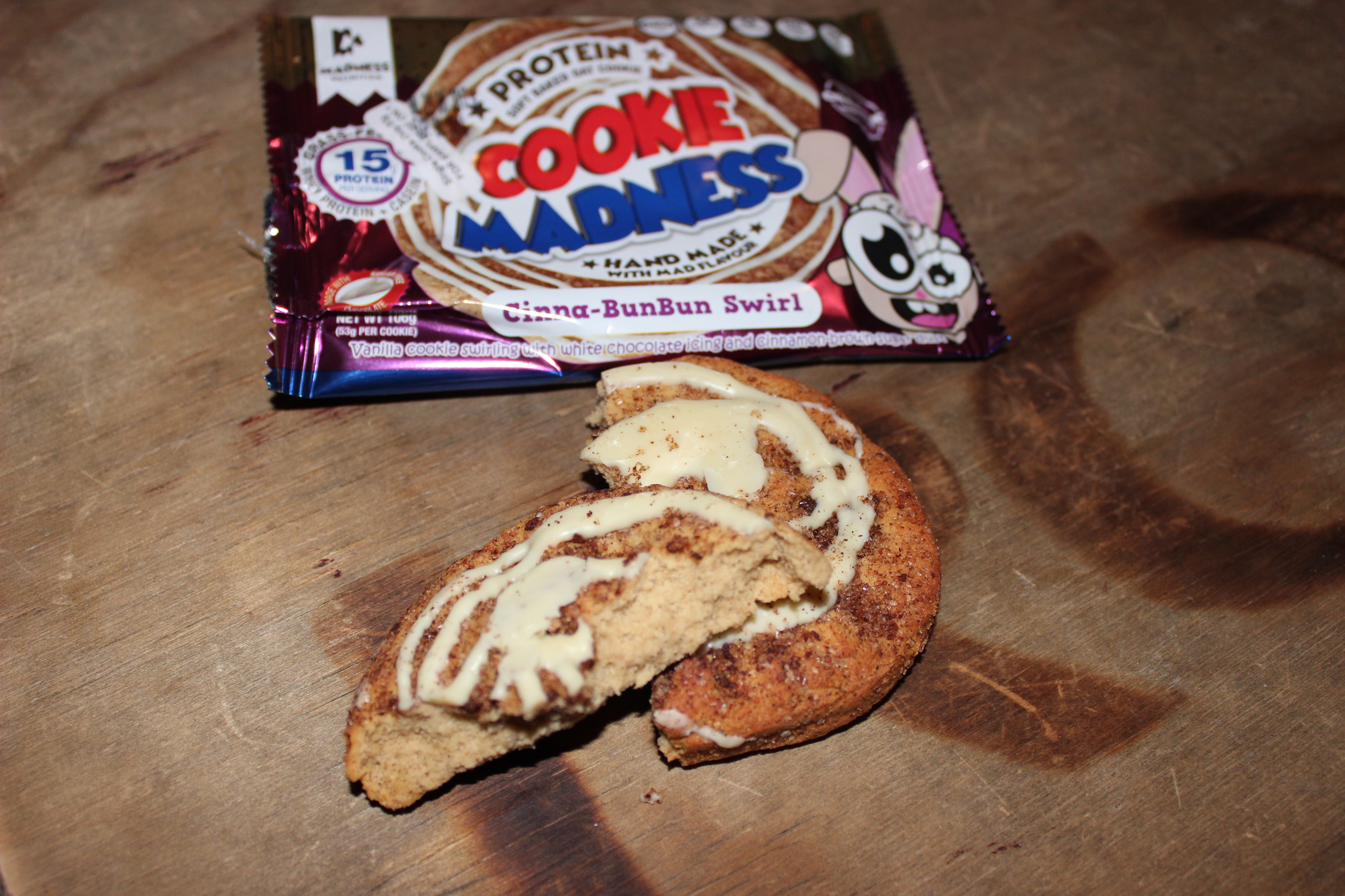 Zu guter Letzt haben wir noch „Cinna-BunBun Swirl“ für euch getestet. Hier müssen wir sagen, dass man von einem „leichtem Beigeschmack“ nicht mehr reden kann. Der Keks schmeckt, als würde man in geschmacksneutrales, veganes Eiweiß beißen. Für uns ist die Sorte leider definitiv durchgefallen. Die Spur von Zimt kann die Mischung aus „Gemüse-Sand-Flavour“ mit Süßstoffbeigeschmack nicht wiedergut machen. Außerdem ist der Cookie deutlich trockener und staubig. Wer „Birthday Cake“ probiert hat könnte sich hier ernsthaft fragen, ob die Kekse überhaupt vom gleichen Hersteller sind. Immerhin sollen beide ja die gleiche Basis, den „Vanilla Cookie“ haben.