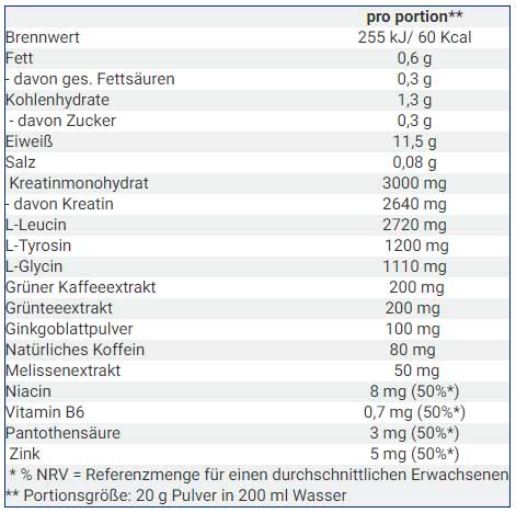 Laut Herstellerangaben entsprechen 20g einer Portion. Jedes Serving enthält 8g Molkenproteinisolat, 3g Creatin Monohydrat, 2720mg L-Leucin, 1200mg L-Tyrosin, 1110mg L-Glycin, 200mg Grüner Kaffee Extrakt, 200mg Grüntee Extrakt, 100mg Ginkgoblattpulver und 50mg Melissenextrakt. Rechnet man alle natürlichen Koffeinquellen zusammen, kommt man auf ca. 80mg Koffein. Dies entspricht in etwa einer Tasse schwarzen Kaffees.